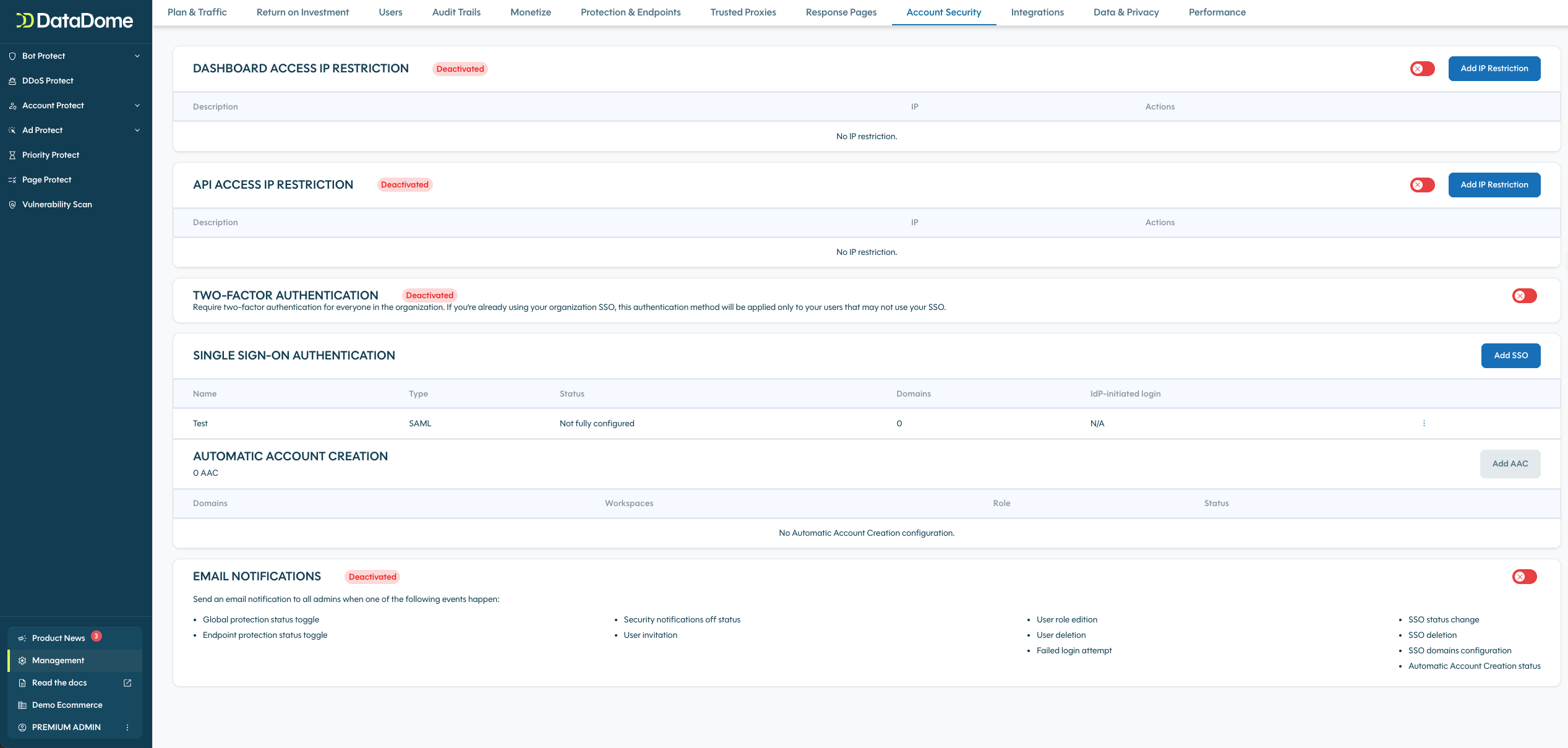 - In the DataDome Console, navigate to Management > Account Security.