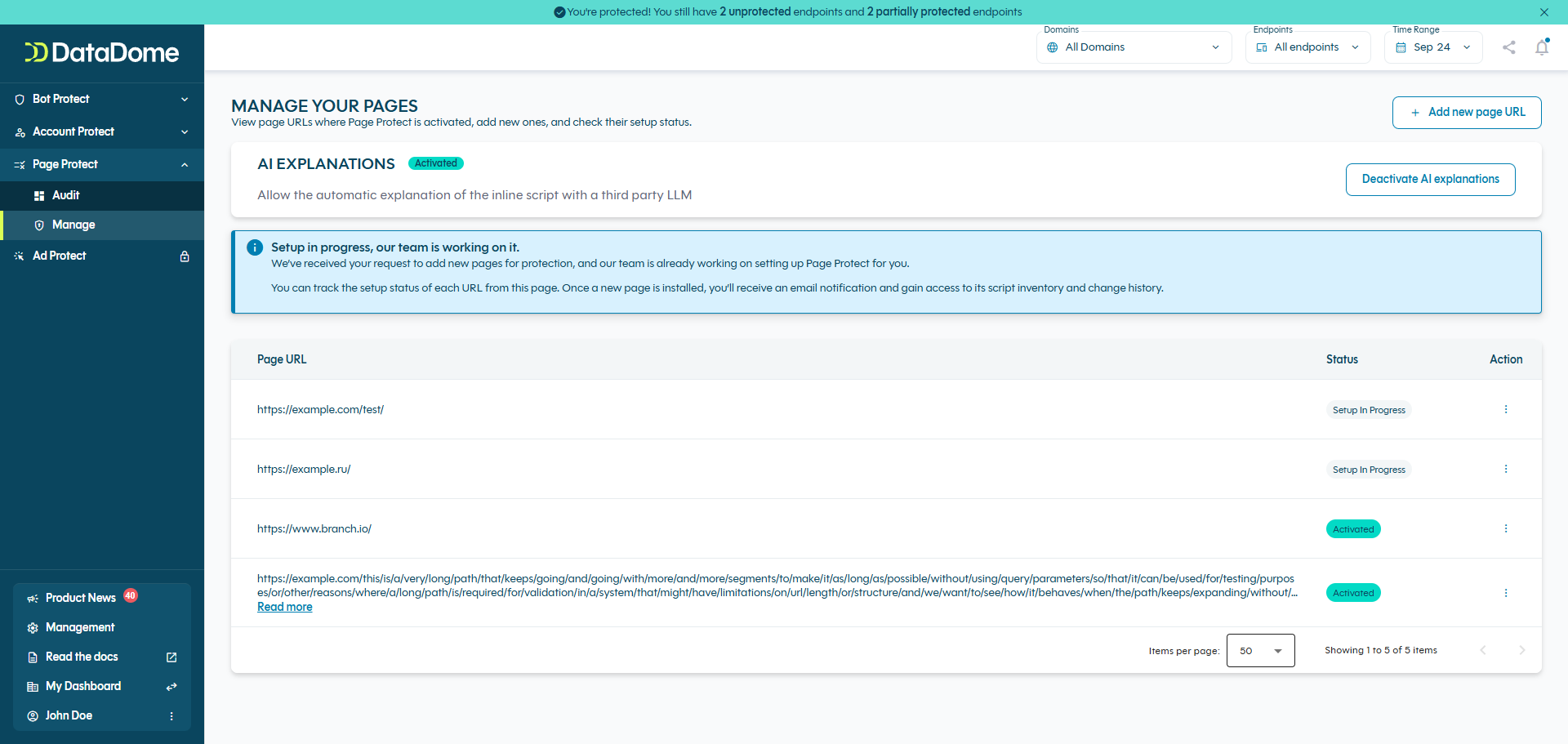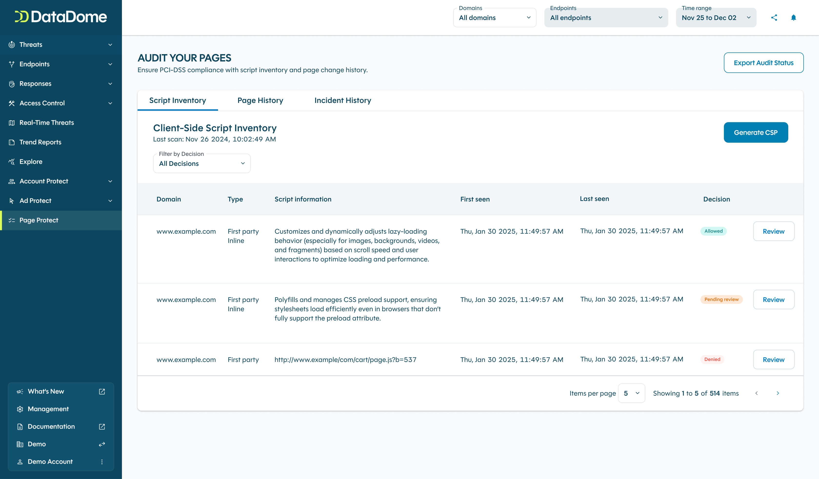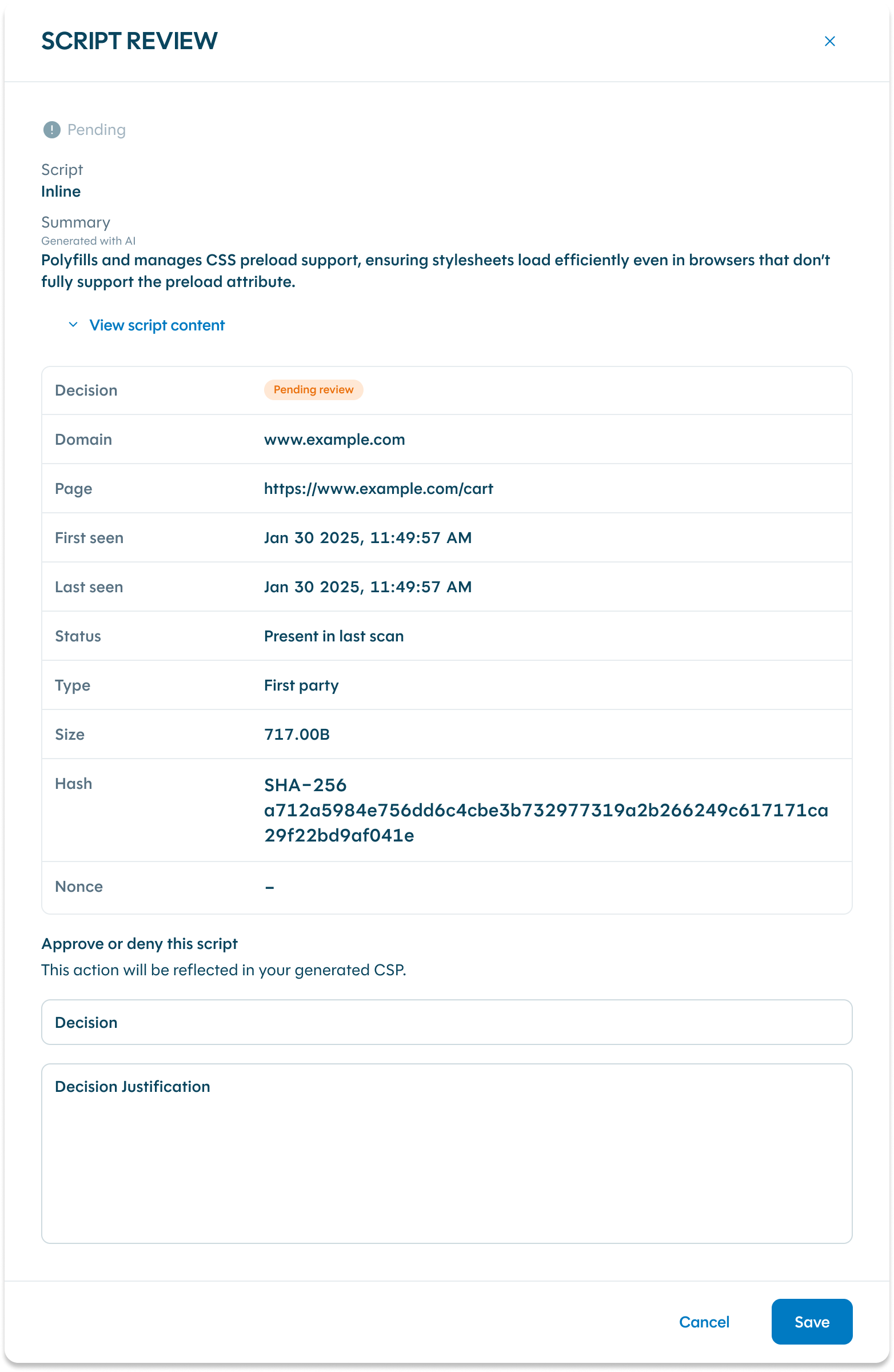 The Page Protect AI script explanation feature describes a script’s behavior in plain language to help you understand its purpose. While it provides insight into the script’s general behavior, it does not highlight potential threats within the code. You must remain vigilant during your assessment. The AI script explanation can be accessed 2 ways, from the script inventory page and from the script review pop up.