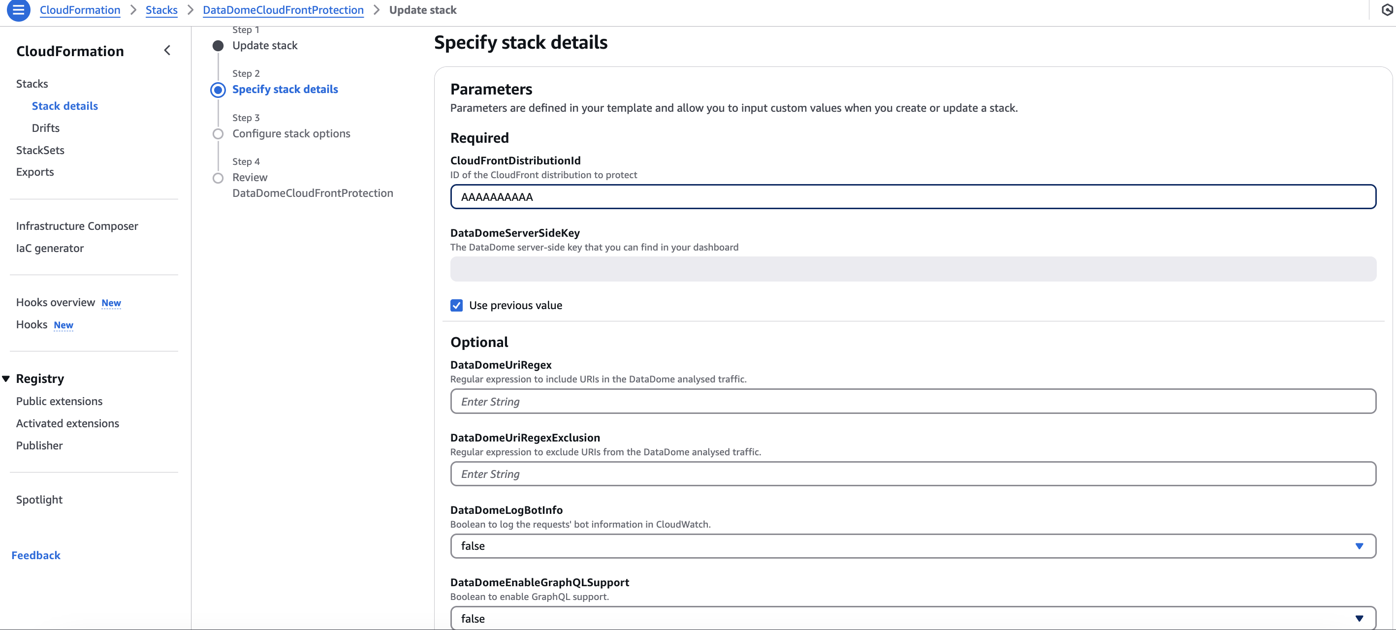 DataDomeCloudFrontProtection). - CloudFrontDistributionId (Required): Enter the ID of the CloudFront distribution you want to protect.