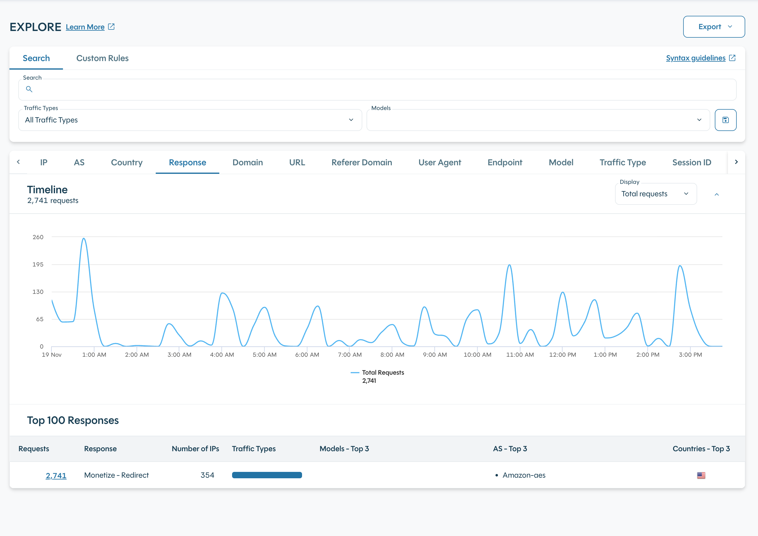 All requests, including those redirected to TollBit, are visible within the DataDome Dashboard.
